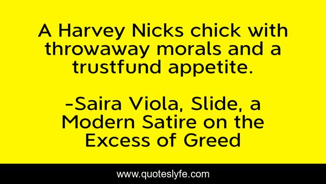 "Saira Viola, Slide, a Modern Satire on the Excess of Greed Quotes." Quoteslyfe.com, 2025. Mon. 08 Dec. 2025. <https://www.quoteslyfe.com/quote/A-Harvey-Nicks-chick-with-throwaway-morals-212761>.