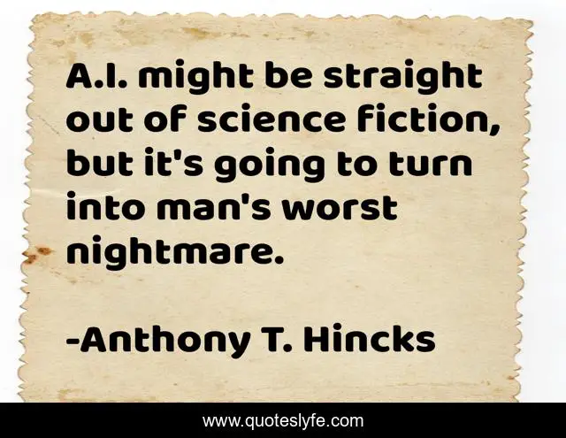 This page presents the quote "A.I. might be straight out of science fiction, but it's going to turn into man's worst nightmare.". Author of this quote is Anthony T. Hincks. This quote is about a-i, life, artificial-intelligence, nightmare, philosophy, robots, science-fiction, computer, man,.