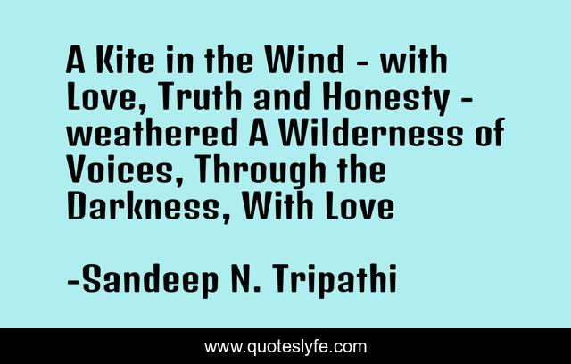 This page presents the quote "A Kite in the Wind - with Love, Truth and Honesty - weathered A Wilderness of Voices, Through the Darkness, With Love". Author of this quote is Sandeep N. Tripathi. This quote is about love, darkness, voices, wind, truth, honesty-integrity-relationship, affection, kite,.