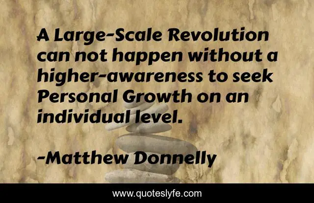 This page presents the quote "A Large-Scale Revolution can not happen without a higher-awareness to seek Personal Growth on an individual level.". Author of this quote is Matthew Donnelly. This quote is about personal-development, evolution, revolution, personal-growth,.