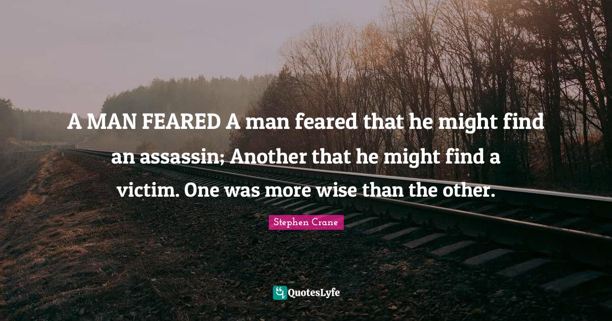 This page presents the quote "A MAN FEARED A man feared that he might find an assassin; Another that he might find a victim. One was more wise than the other.". Author of this quote is Stephen Crane. This quote is about assassins, men, victim, might, wise,.