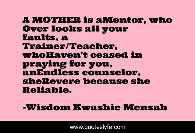 This page presents the quote "A MOTHER is aMentor, who Over looks all your faults, a Trainer/Teacher, whoHaven't ceased in praying for you, anEndless counselor, sheRevere because she Reliable.". Author of this quote is Wisdom Kwashie Mensah. This quote is about sefless, love, beauty, mothers, mother-s-day, mother, wkm, affection,.