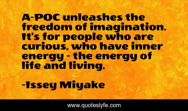This page presents the quote "A-POC unleashes the freedom of imagination. It's for people who are curious, who have inner energy - the energy of life and living.". Author of this quote is Issey Miyake. This quote is about freedom, life, people,.