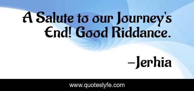 This page presents the quote "A Salute to our Journey's End! Good Riddance.". Author of this quote is Jerhia. This quote is about broken-heart, break-up, give-up, relationship, broken,.