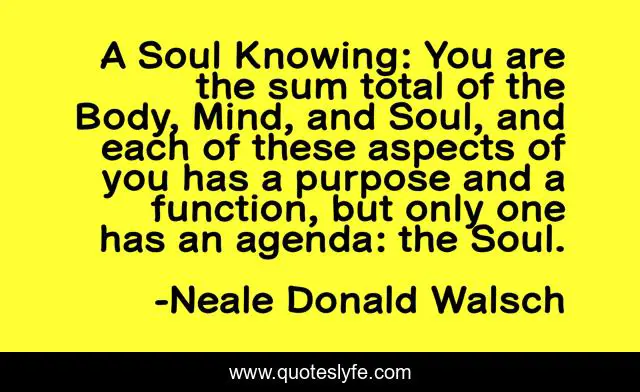 This page presents the quote "A Soul Knowing: You are the sum total of the Body, Mind, and Soul, and each of these aspects of you has a purpose and a function, but only one has an agenda: the Soul.". Author of this quote is Neale Donald Walsch. This quote is about mind, and-soul,.