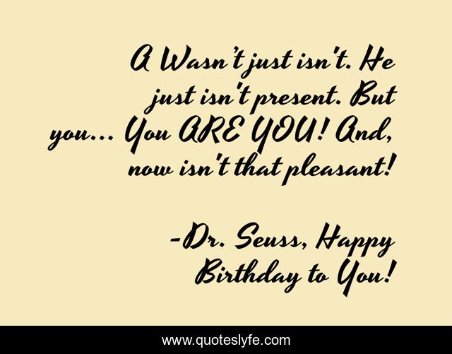 This page presents the quote "A Wasn’t just isn't. He just isn't present. But you… You ARE YOU! And, now isn't that pleasant!". Author of this quote is Dr. Seuss, Happy Birthday to You!. This quote is about dr-seuss, children-s-literature, yourself, optimistic, optimist, comedy,.