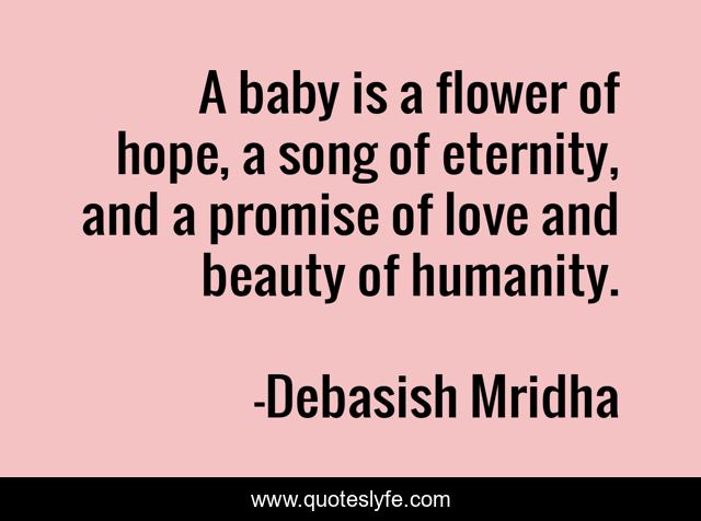 This page presents the quote "A baby is a flower of hope, a song of eternity, and a promise of love and beauty of humanity.". Author of this quote is Debasish Mridha. This quote is about debasish, a-baby-is-a-flower-of-hope, beauty-of-humanity, philosophy, debasish-mridha, inspirational, mridha, song-of-eternity, enthusiasm,.