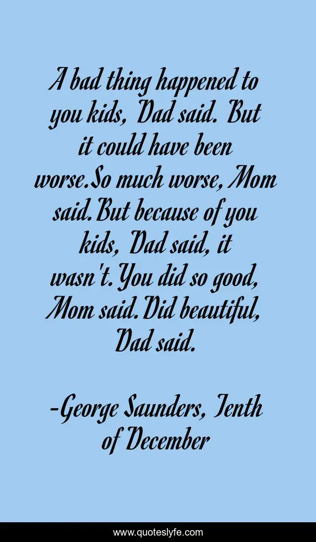 This page presents the quote "A bad thing happened to you kids, Dad said. But it could have been worse.So much worse, Mom said.But because of you kids, Dad said, it wasn't.You did so good, Mom said.Did beautiful, Dad said.". Author of this quote is George Saunders, Tenth of December. This quote is about beautiful, trauma, children,.