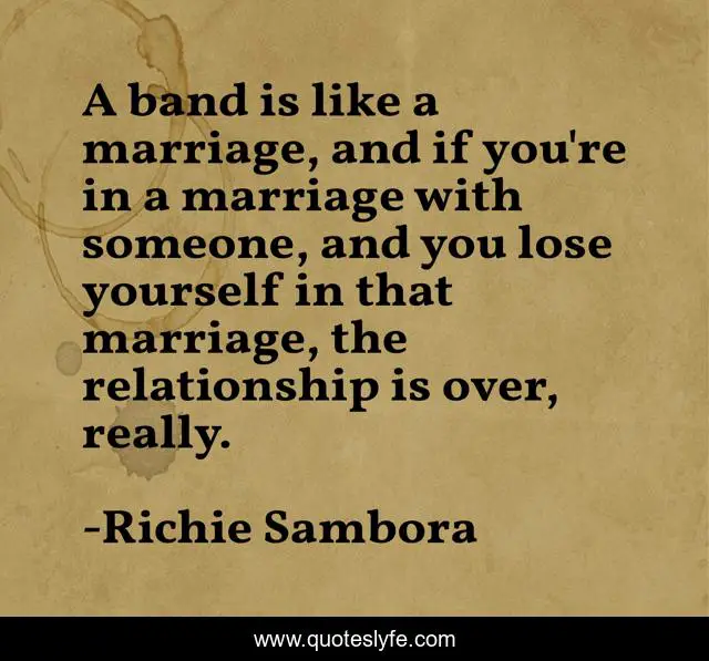 This page presents the quote "A band is like a marriage, and if you're in a marriage with someone, and you lose yourself in that marriage, the relationship is over, really.". Author of this quote is Richie Sambora. This quote is about relationship, yourself,.