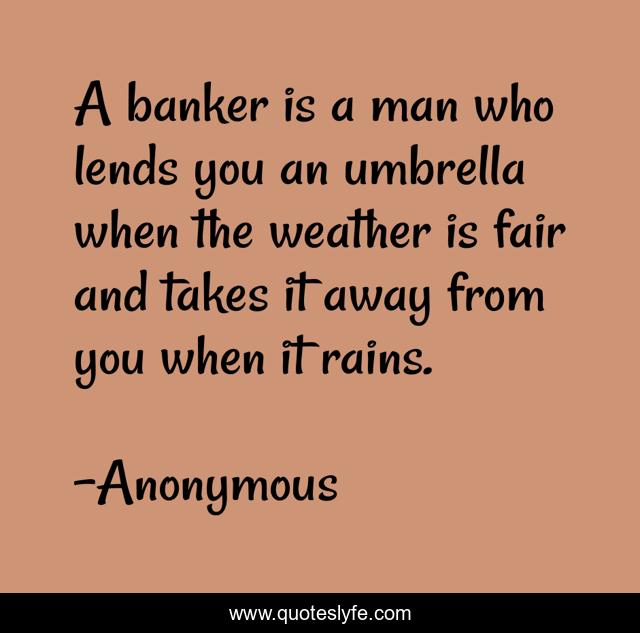 This page presents the quote "A banker is a man who lends you an umbrella when the weather is fair and takes it away from you when it rains.". Author of this quote is Anonymous. .