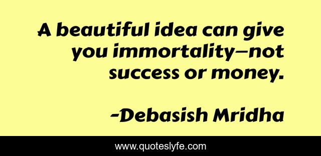 This page presents the quote "A beautiful idea can give you immortality—not success or money.". Author of this quote is Debasish Mridha. This quote is about success, beautiful-idea, money, philosophy, debasish-mridha, quotes, immortality, inspirational, enthusiasm,.
