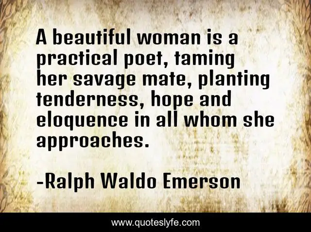 This page presents the quote "A beautiful woman is a practical poet, taming her savage mate, planting tenderness, hope and eloquence in all whom she approaches.". Author of this quote is Ralph Waldo Emerson. This quote is about relationships, woman, love, men, affection, women,.