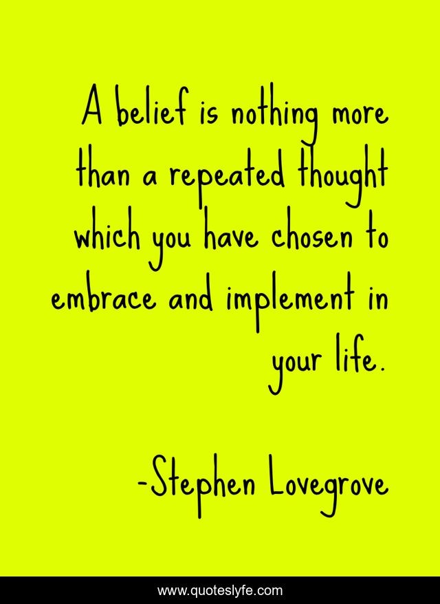 This page presents the quote "A belief is nothing more than a repeated thought which you have chosen to embrace and implement in your life.". Author of this quote is Stephen Lovegrove. This quote is about confidence, personal-growth, positive, motivational, optimistic, inspirational, self-help, enthusiasm, beliefs,.