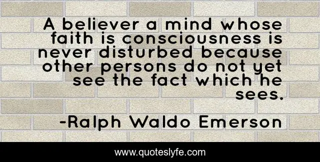 This page presents the quote "A believer a mind whose faith is consciousness is never disturbed because other persons do not yet see the fact which he sees.". Author of this quote is Ralph Waldo Emerson. This quote is about faith, belief,.