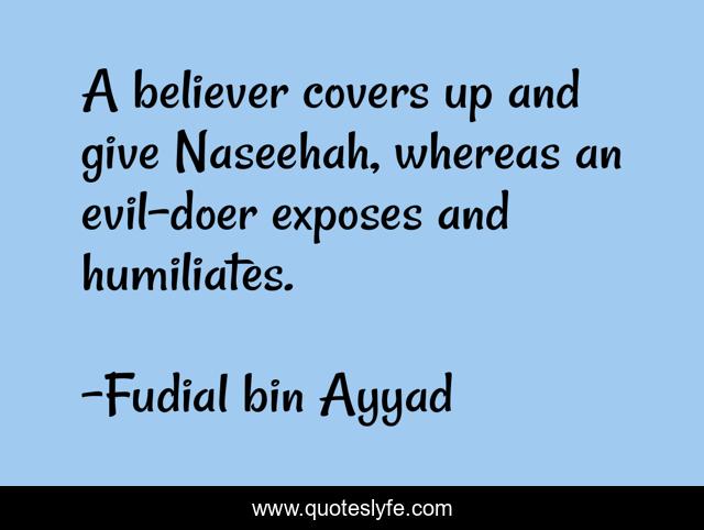 This page presents the quote "A believer covers up and give Naseehah, whereas an evil-doer exposes and humiliates.". Author of this quote is Fudial bin Ayyad. This quote is about etiquette, adhab, expose, believer, islam, naseehah,.