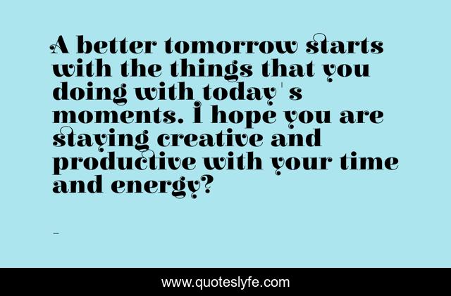 This page presents the quote "A better tomorrow starts with the things that you doing with today's moments. I hope you are staying creative and productive with your time and energy?". Author of this quote is . This quote is about edmond-mbiaka, staying-productive, your-time-and-energy, a-better-tomorrow, creative,.
