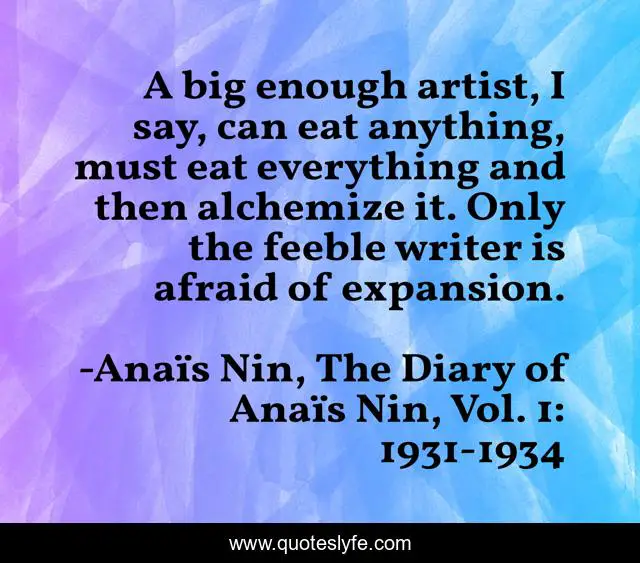 This page presents the quote "A big enough artist, I say, can eat anything, must eat everything and then alchemize it. Only the feeble writer is afraid of expansion.". Author of this quote is Anaïs Nin, The Diary of Anaïs Nin, Vol. 1: 1931-1934. This quote is about writers, writing,.