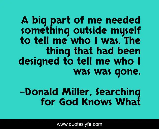 This page presents the quote "A big part of me needed something outside myself to tell me who I was. The thing that had been designed to tell me who I was was gone.". Author of this quote is Donald Miller, Searching for God Knows What. This quote is about discipleship, sovereignty-of-god, theology,.