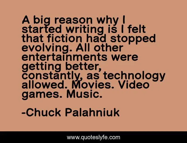 This page presents the quote "A big reason why I started writing is I felt that fiction had stopped evolving. All other entertainments were getting better, constantly, as technology allowed. Movies. Video games. Music.". Author of this quote is Chuck Palahniuk. This quote is about video games, music, writing,.