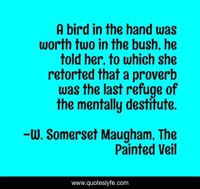 This page presents the quote "A bird in the hand was worth two in the bush, he told her, to which she retorted that a proverb was the last refuge of the mentally destitute.". Author of this quote is W. Somerset Maugham, The Painted Veil. This quote is about proverb, humor, proverbs,.