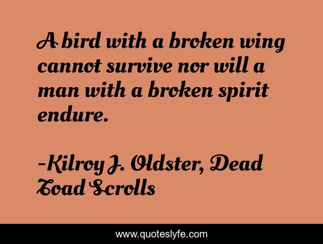 This page presents the quote "A bird with a broken wing cannot survive nor will a man with a broken spirit endure.". Author of this quote is Kilroy J. Oldster, Dead Toad Scrolls. This quote is about spiritual-development, survival, spirit,.