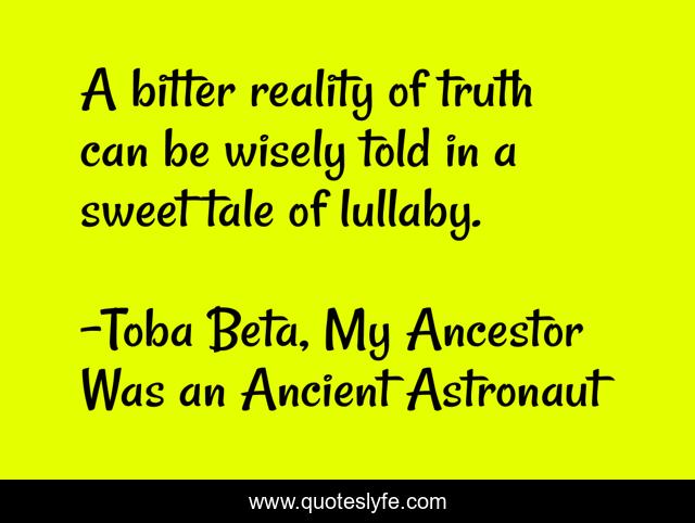 This page presents the quote "A bitter reality of truth can be wisely told in a sweet tale of lullaby.". Author of this quote is Toba Beta, My Ancestor Was an Ancient Astronaut. This quote is about life, sweet, reality, lies, truth, tell-a-tale, bitter,.