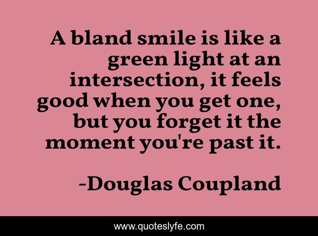 This page presents the quote "A bland smile is like a green light at an intersection, it feels good when you get one, but you forget it the moment you're past it.". Author of this quote is Douglas Coupland. This quote is about past, light, good,.