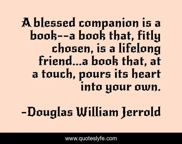 This page presents the quote "A blessed companion is a book--a book that, fitly chosen, is a lifelong friend...a book that, at a touch, pours its heart into your own.". Author of this quote is Douglas William Jerrold. This quote is about reading, book-lovers,.