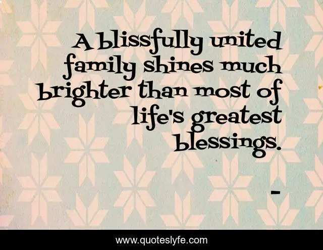 This page presents the quote "A blissfully united family shines much brighter than most of life's greatest blessings.". Author of this quote is . This quote is about edmond-mbiaka, blissful, blessings, life-s-blessings, a-united-family,.