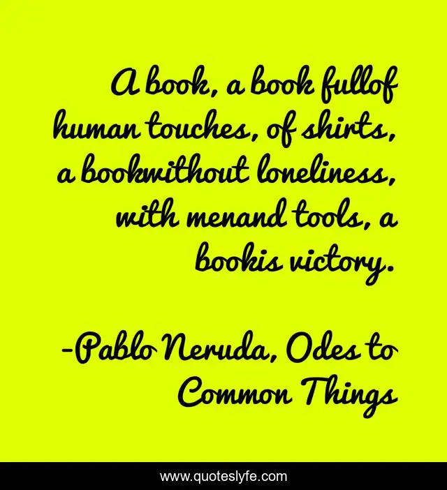 This page presents the quote "A book, a book fullof human touches, of shirts, a bookwithout loneliness, with menand tools, a bookis victory.". Author of this quote is Pablo Neruda, Odes to Common Things. This quote is about books, poetry,.