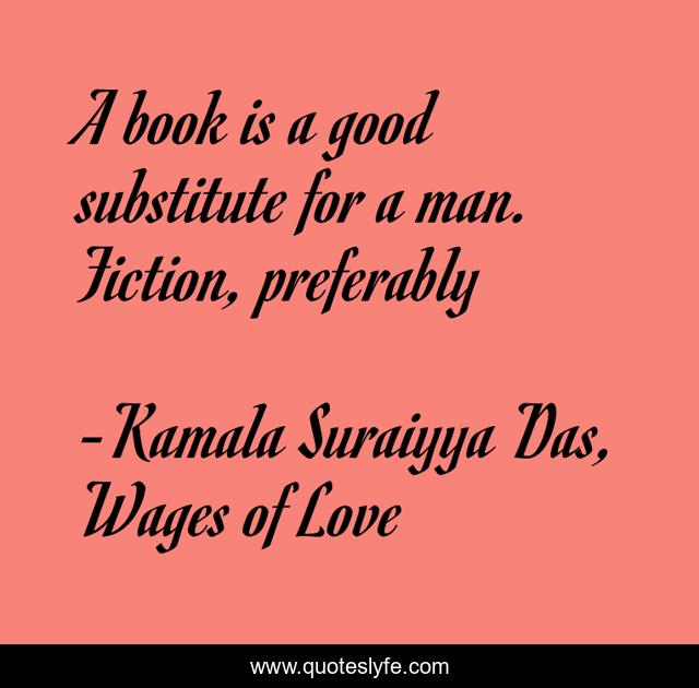 This page presents the quote "A book is a good substitute for a man. Fiction, preferably". Author of this quote is Kamala Suraiyya Das, Wages of Love. This quote is about books, substitute, men,.