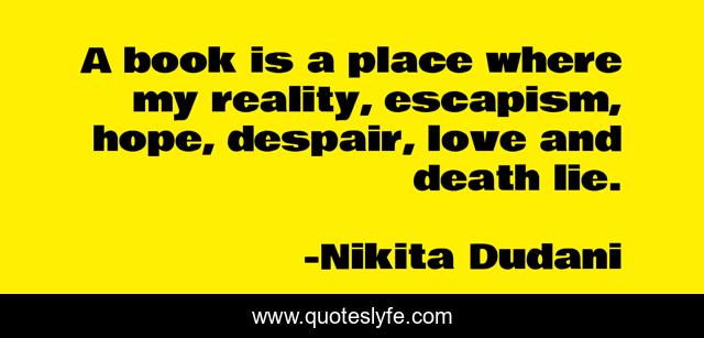 This page presents the quote "A book is a place where my reality, escapism, hope, despair, love and death lie.". Author of this quote is Nikita Dudani. This quote is about plays, novels, writers, books, poems, reading,.