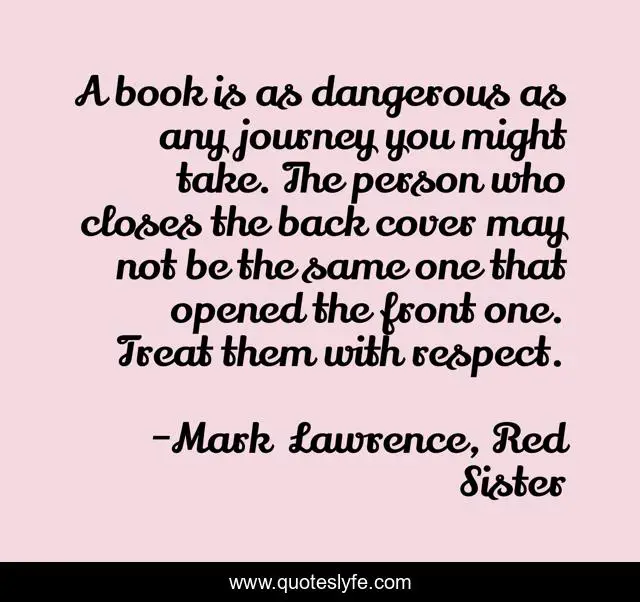 This page presents the quote "A book is as dangerous as any journey you might take. The person who closes the back cover may not be the same one that opened the front one. Treat them with respect.". Author of this quote is Mark Lawrence, Red Sister. This quote is about book, journey,.
