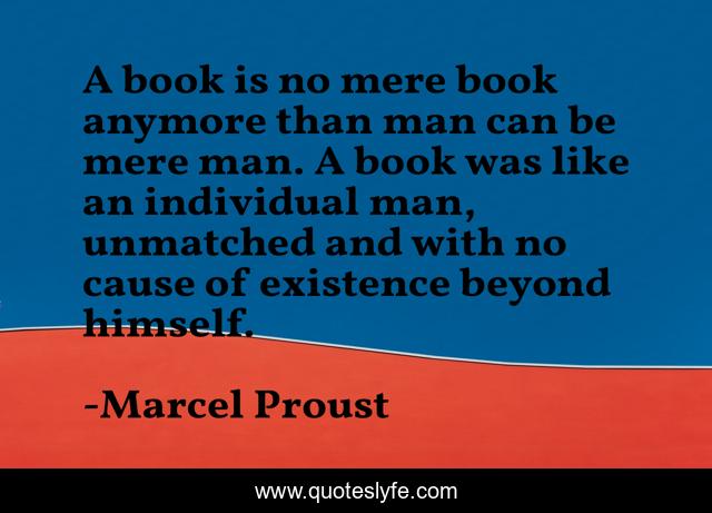 This page presents the quote "A book is no mere book anymore than man can be mere man. A book was like an individual man, unmatched and with no cause of existence beyond himself.". Author of this quote is Marcel Proust. .