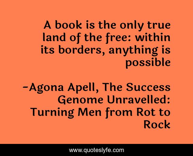 This page presents the quote "A book is the only true land of the free: within its borders, anything is possible". Author of this quote is Agona Apell, The Success Genome Unravelled: Turning Men from Rot to Rock. This quote is about quotes, freedom-of-thought, book, freedom-of-expression,.
