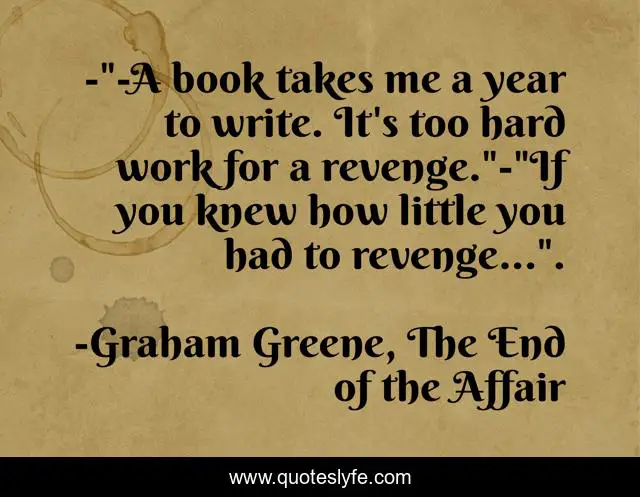 This page presents the quote "-"-A book takes me a year to write. It's too hard work for a revenge."-"If you knew how little you had to revenge...".". Author of this quote is Graham Greene, The End of the Affair. This quote is about graham-greene, the-end-of-the-affair, revenge,.