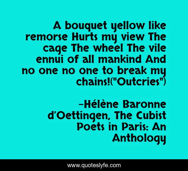 "Hélène Baronne d’Oettingen, The Cubist Poets in Paris: An Anthology Quotes." Quoteslyfe.com, 2025. Sat. 06 Dec. 2025. <https://www.quoteslyfe.com/quote/A-bouquet-yellow-like-remorse-Hurts-my-255725>.