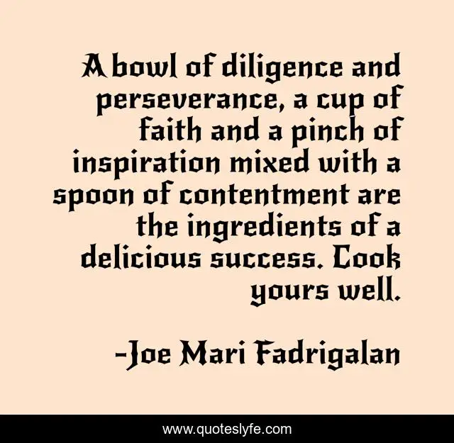 This page presents the quote "A bowl of diligence and perseverance, a cup of faith and a pinch of inspiration mixed with a spoon of contentment are the ingredients of a delicious success. Cook yours well.". Author of this quote is Joe Mari Fadrigalan. This quote is about faith, life, perseverance, success, diligence, ingredients, contentment, cook, formula,.