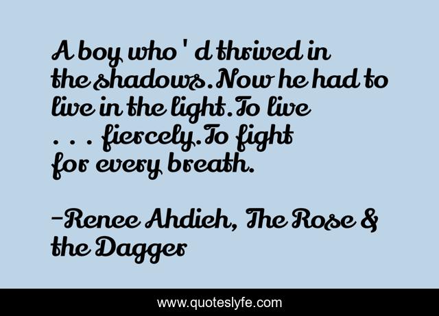 This page presents the quote "A boy who'd thrived in the shadows.Now he had to live in the light.To live . . . fiercely.To fight for every breath.". Author of this quote is Renee Ahdieh, The Rose & the Dagger. This quote is about shadows, live, fight,.