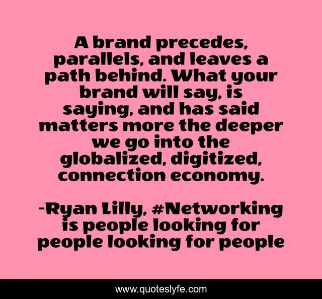 "Ryan Lilly, #Networking is people looking for people looking for people Quotes." Quoteslyfe.com, 2025. Sat. 06 Dec. 2025. <https://www.quoteslyfe.com/quote/A-brand-precedes-parallels-and-leaves-a-207187>.