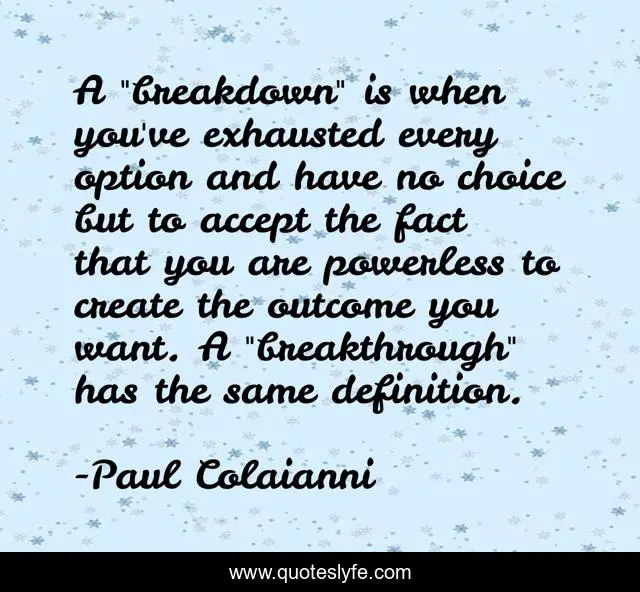 This page presents the quote "A "breakdown" is when you've exhausted every option and have no choice but to accept the fact that you are powerless to create the outcome you want. A "breakthrough" has the same definition.". Author of this quote is Paul Colaianni. This quote is about control, stress, personal-growth, overwhelm, breakthroughs, breakthrough, outcome,.