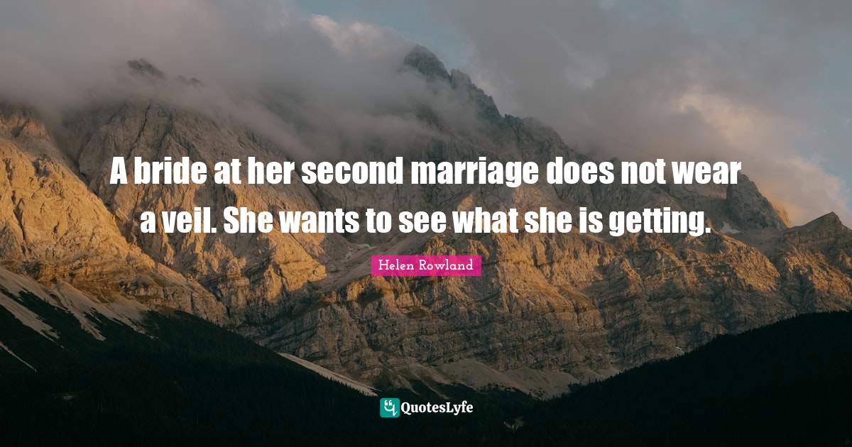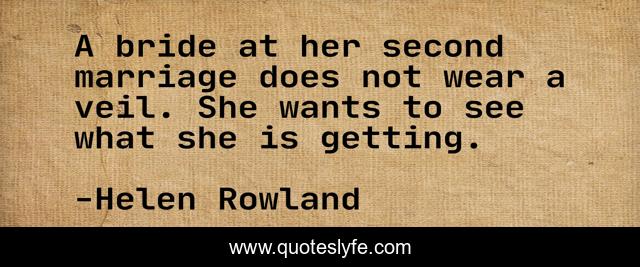 This page presents the quote "A bride at her second marriage does not wear a veil. She wants to see what she is getting.". Author of this quote is Helen Rowland. This quote is about bride, see, wedding,.