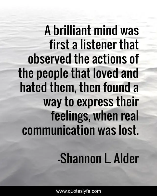 This page presents the quote "A brilliant mind was first a listener that observed the actions of the people that loved and hated them, then found a way to express their feelings, when real communication was lost.". Author of this quote is Shannon L. Alder. This quote is about composers, brilliant-minds, unique, art, artist, communication, create, creative-minds, feelings,.
