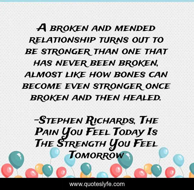 "Stephen Richards, The Pain You Feel Today Is The Strength You Feel Tomorrow Quotes." Quoteslyfe.com, 2025. Sun. 07 Dec. 2025. <https://www.quoteslyfe.com/quote/A-broken-and-mended-relationship-turns-out-78310>.