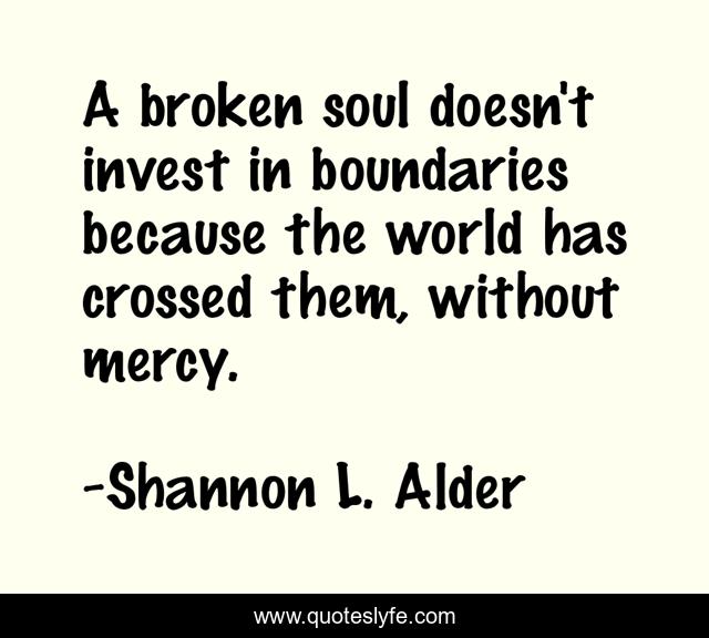 This page presents the quote "A broken soul doesn't invest in boundaries because the world has crossed them, without mercy.". Author of this quote is Shannon L. Alder. This quote is about caring, mercy, interactions, not-caring, lack-of-filters, boundaries, broken-souls, upbringing, setting-boundaries,.