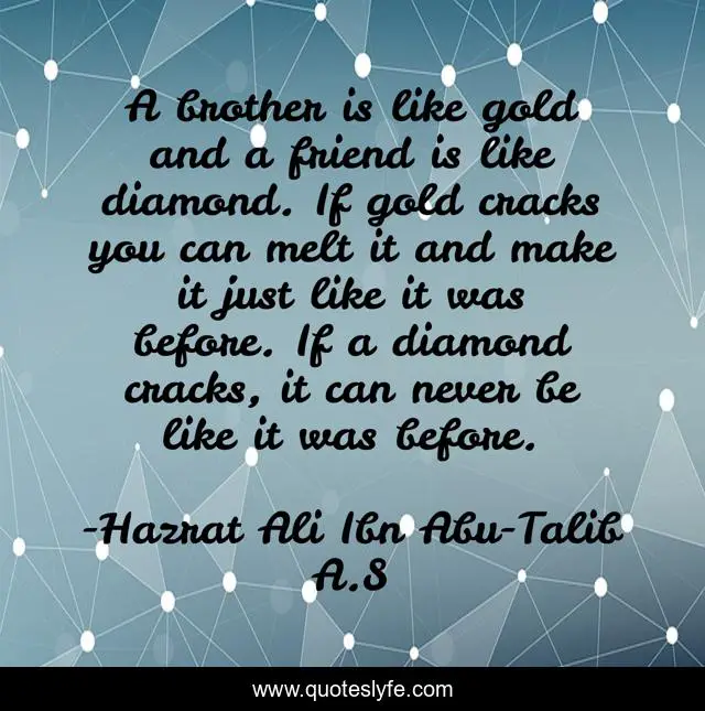 This page presents the quote "A brother is like gold and a friend is like diamond. If gold cracks you can melt it and make it just like it was before. If a diamond cracks, it can never be like it was before.". Author of this quote is Hazrat Ali Ibn Abu-Talib A.S. This quote is about enthusiasm, family, inspirational,.