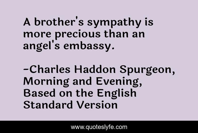 This page presents the quote "A brother's sympathy is more precious than an angel's embassy.". Author of this quote is Charles Haddon Spurgeon, Morning and Evening, Based on the English Standard Version. This quote is about discipleship, encouragement,.