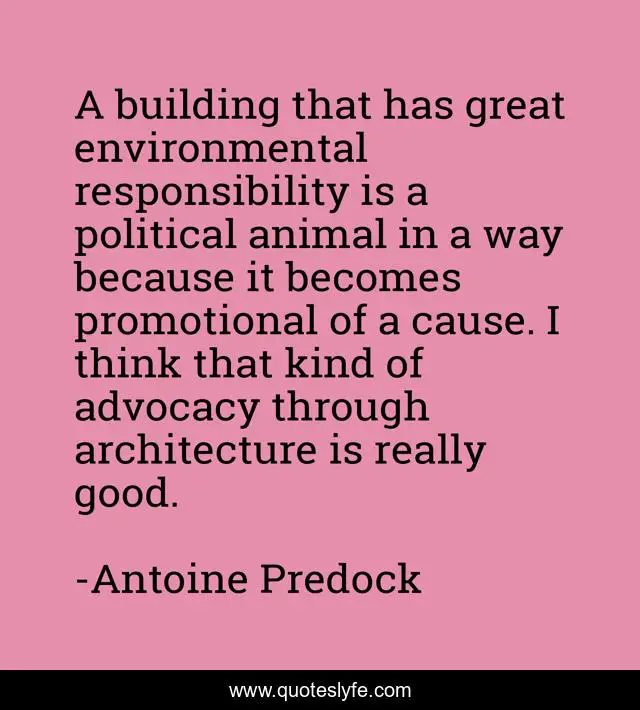 This page presents the quote "A building that has great environmental responsibility is a political animal in a way because it becomes promotional of a cause. I think that kind of advocacy through architecture is really good.". Author of this quote is Antoine Predock. This quote is about great, good, responsibility,.
