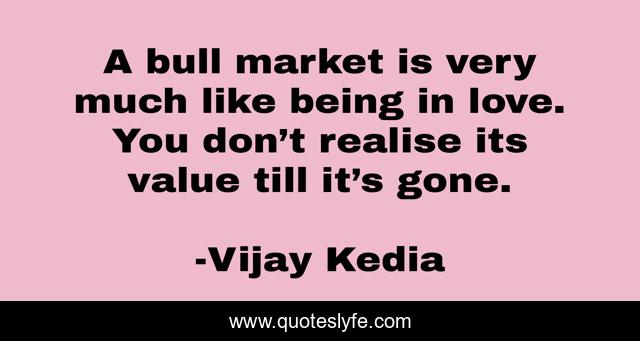 This page presents the quote "A bull market is very much like being in love. You don’t realise its value till it’s gone.". Author of this quote is Vijay Kedia. This quote is about business, enthusiasm, stock-market, inspirational, success,.