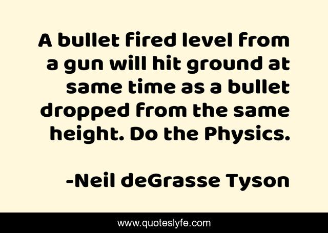 This page presents the quote "A bullet fired level from a gun will hit ground at same time as a bullet dropped from the same height. Do the Physics.". Author of this quote is Neil deGrasse Tyson. This quote is about physics, gravity, guns,.